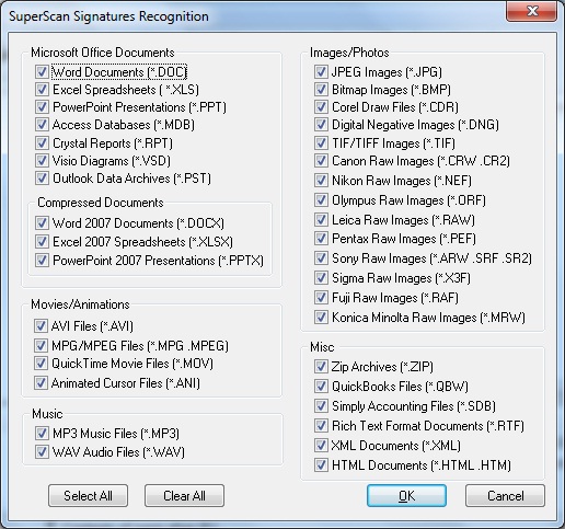 در قسمت بعدی که با رنگ قرمز مشخص کردم شما تعیین میکنید برنامه به دنبال چه فایل هایی بگردد.در یک مثال ساده میتونم بگم مثلا شما روی فلش مموریتون فقط تعدادی موسیقی(MP3) داشتید که حالا حذف شده.حالا میخواین به وسیله قسمت سوپراسکن فایلهای پاک شده را بازگردانی کنید.در این صورت فقط کافیه که به برنامه بگید دنبال چه فایلی بگرده و بیهوده انواع فایل ها رو مورد جست جو قرار نده.حالا براتون توضیح میدم چطور.!