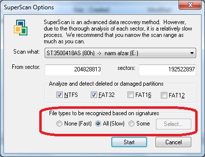 همون طور که در تصویر هم مشاهده میکنید قسمت اول NONE هست که با انتخاب این گزینه برنامه یه جست و جویی انجام میده که نسبت به گزینه ی بعدی ضعیف تر هست.قسمت دوم ALL هست.همون طور که میبینید جلوی این گزینه نوشته SLOW(کند) و میشه نتیجه گرفت که این گزینه یک حالت کلی داره و به نظر من زمانی کار برد داره که شما مثلا اطلاعات فلش مموریتون رو از دست دادید.ولی یه نوع دو نوع نبوده و انواع اسناد و فایل ها بوده.در این صورت بهتره که از این گزینه استفاده کنید که در این حالت برنامه فلش شما را از نظر انواع فرمت ها مورد بررسی قرار میده.