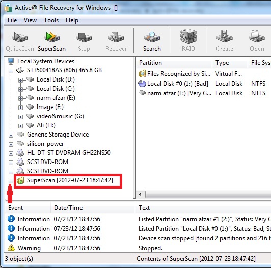 مراحل اول کار مثل بالا هست.یعنی اول میریم درایو و یا حافظه ی مورد نظر را از لیست انتخاب میکنیم.و بعد به جای زدن دکمه کوئیک اسکن دکمه سوپر اسکن  را کلیک کنید.