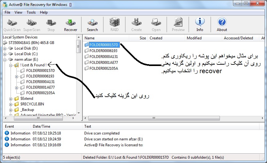 را بزنیم.برنامه شروع به ریکاوری کردن میکند.البته در اصل الان ریکاوری نمی کنیم بلکه برنامه در حال پیدا کردن فایل ها یا به اصطلاح اسکن است تا بعد ما هر کدام را که خواستیم بازگردانی و اصطلاحا ریکاوری کنیم.بعد از اتمام عملیات اسکن شما میبینید که نتایج به نمایش در می آید و اگر خوب توجه کنید پوشه ای میبینید با نام !lost & found! که در این پوشه تمام چیز هایی که پاک شده بودند و البته در عملیات اسکن پیدا شده اند را می توانید ببینید.البته توجه داشته باشید که طبق اطلاعاتی که دارم و البته خود برنامه هم گفته بود این حالت، خیلی نسبت به حالت سوپر اسکن ضعیف تر است.خب الان برنامه برای ما فایل های حذف شده را پیدا کرده است و ما هر کدام را که خواستیم باز یابی کنیم باید انتخاب کرده و دکمه ریکاوری را فشرده تا پنجره ای باز شده و شما محلی که می خواهید فایل های بازیابی شده را در آن بریزید انتخاب کنید.یک نکته ی خیلی مهم:حتما توجه داشته باشید که اگر مثلا درایوE را اسکن کردید به هیچ وجه فایل های باز یابی شده را روی همان درایو ذخیره و در اصل ریکاوری نکنید.اگر سردرگم شدید به تصاویر توجه کنید.